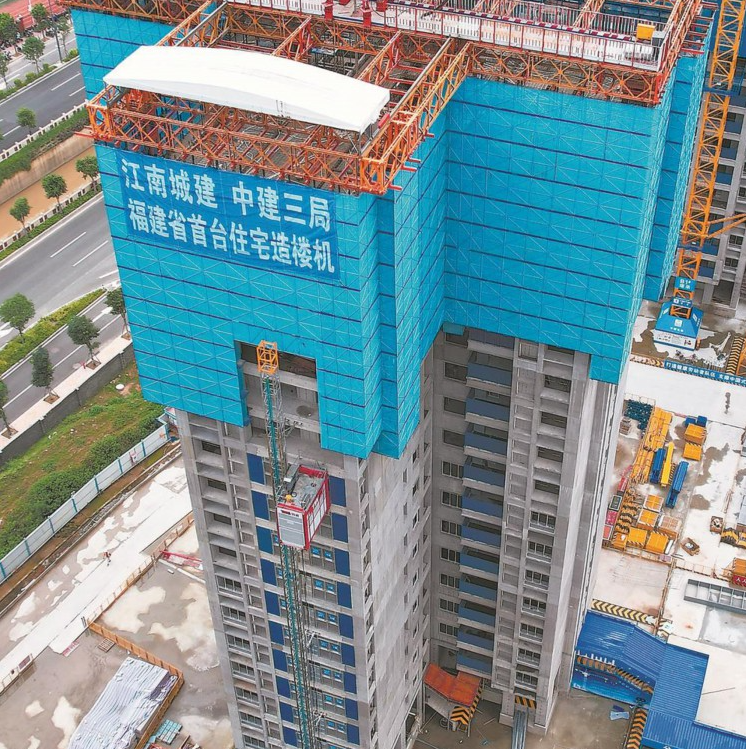 该装备看似是个“大家伙”,却“身轻如燕”,整体爬升一个结构层(约3米)仅需1~1.5小时;集成设置管线喷淋、伸缩雨棚、液压布料机等,有效防晒防雨、降尘降噪,为全天候作业创造条件,“安全感”拉满。“借助它可实现‘四天一层楼’的施工速度,对比传统爬模施工,造楼机有效助力工效提升30%,每造一层楼可节约2~3天。”温国伟说。