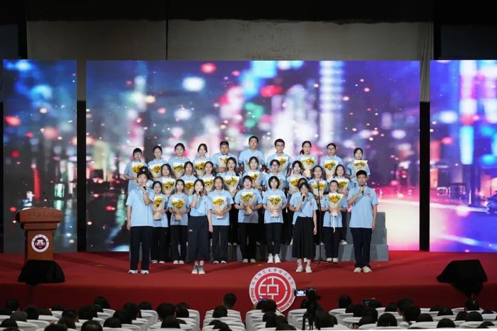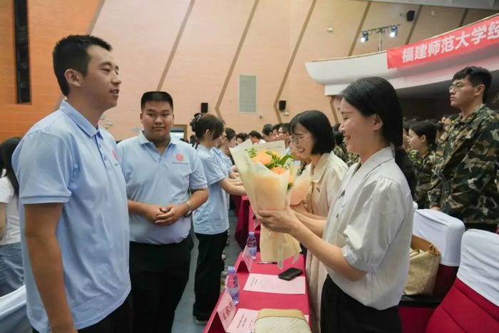 开学典礼现场,2024级新生代表为现场教师代表献花,表达对老师的感激之情,促进师生之间的良好互动。