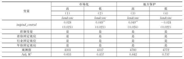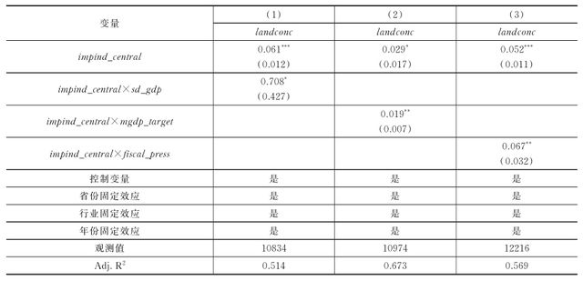 第二,增长目标压力。表 3 列(2)中国家重点产业政策的估计系数显著为正,而国家重点产业政策与增长目标压力交互项(impind_central×mgdp_target)的估计系数在 5% 的水平上显著为正。这表明增长目标压力对国家重点产业政策的产业结构趋同效应具有正向调节作用,即国家重点产业政策显著促进地级市平均增长目标压力较大省份的产业结构趋同。这表明,在晋升压力和增长目标压力驱动下,地方政府更容易将土地要素资源“一致地”配置到国家重点产业政策支持的行业。