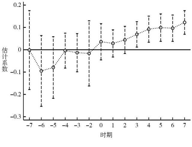 其中,Dummy 为一系列虚拟变量,如果该年份距离国家重点产业政策实施的期数为 τ,那么该变量取 1,否则取 0,本文将政策冲击期数小于-7 的统一为第-7 期,超过 7 期的统一为第 7 期,基期为政策冲击的前一年。因此,α0 为国家重点产业政策实施当期的效应,α-7-α-2 代表国家重点产业政策实施前的效应,α1-α7 则捕捉国家重点产业政策实施后的动态效应。如果满足平行趋势假设,则α-7-α-2 应不显著。