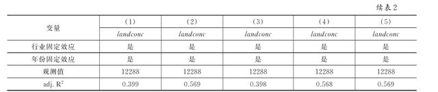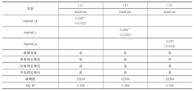 其中,p 代表省份,k 代表行业,t代表年份。landconcpkt表示省份 p 的行业 k 在第 t年土地配置的行业地理集中熵,基于土地要素的视角来衡量省内产业结构趋同;impindpkt代表重点产业政策外生冲击的虚拟变量。Xpkt为一系列行业、省份层面的控制变量。rp、rk和 rt分别表示省份、行业和时间固定效应。εpkt为随机扰动项。