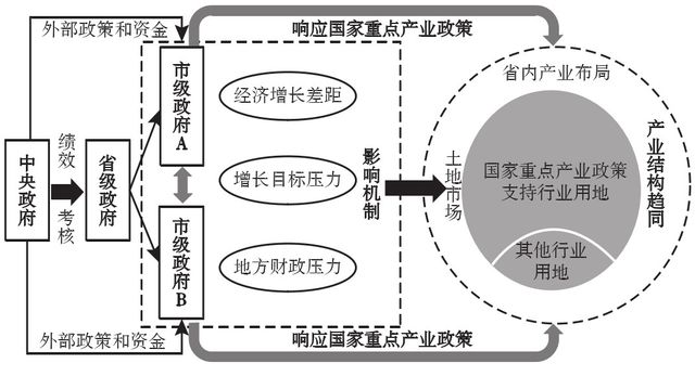本文的研究对象是国家重点产业政策引导下的土地市场。国家重点产业政策作为一项引领产业发展方向和产业结构升级的政策工具,对地方政府配置要素资源和优化产业布局存在着重要影响。为了完成既定的经济增长目标和达到中央政府的政策需求,地方政府积极争取刺激经济增长的外部资金支持,盲目实施与自身比较优势不相符的产业政策,将土地资源配置到国家重点产业政策支持的行业,鼓励发展一些能够产生明星效应的产业,造成了土地市场行业偏向扭曲。这种主观上“中央舞剑、地方跟风”的发展模式客观上导致地区间产业同质化的形成,表现为土地市场行业偏向扭曲并深刻影响着地区间产业结构趋同(王燕武、王俊海,2009;吴意云、朱希伟,2015)。参与中央和地方政府间的双重博弈过程中,地方政府为了完成经济增长目标的承诺,逐渐形成了向中央政府争取外部资金支持、推行地方保护主义的发展路径,所导致的市场分割很大程度上阻碍了区域间分工、经济协同发展和建设全国统一大市场的进程。