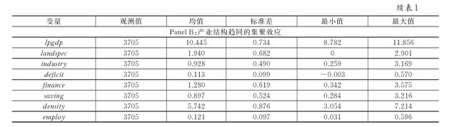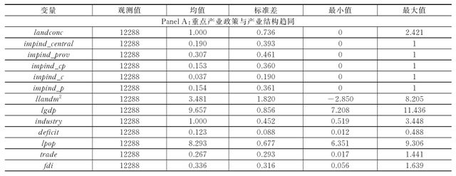 工业用地出让是地方政府招商引资和刺激经济增长的重要手段。因此,本文着重探讨工业行业产业结构趋同现象。本文使用的数据主要分为三类:第一类是微观土地交易数据,本文从土地市场化收集了 2007-2019 年共计 2287233 条全国土地交易的出让结果交易公告数据,出让结果中包括每一交易地块的位置信息、行业信息、出让价格、出让面积和用地类型等重要信息。本文根据每宗土地的行业用途得到 43 个大类行业的工业用地情况,并根据土地出让面积计算得到各省土地要素资源的地理集中熵(landconc)和行业专业化(landspec)指数,以此来衡量省内产业结构趋同。第二类是重点产业政策的数据,本文收集整理中央和地方政府制定的“十一五”“十二五”“十三五”规划文件,整理出其中提及的鼓励发展的行业,该数据来源于 CNRDS 的产业政策数据库(IPRD)。第三类是其他数据,包括各类控制变量,原始数据主要来自历年《中国统计年鉴》《中国城市统计年鉴》、Wind数据库和 CSMAR数据库等。为消除极端值和价格因素的影响,本文对所有连续变量进行上下 1% 缩尾,并将所有价格变量通过省份 CPI调整到 2007年不变价。相关变量的描述性统计如表 1所示。