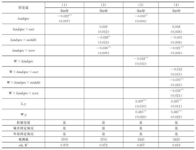 表 8 列(3)中 landspec 的估计系数为负,且在 1% 的水平上显著,这一结果与列(1)一致。在空间溢出效应上,产业结构趋同的空间滞后项(W×landspec)为负,且在 1% 的水平上显著,表明邻市的行业分散化阻碍了本市的经济发展,这意味着产业结构趋同不存在地区经济集聚效应,总体上不但阻碍本市的经济发展,而且对于邻市的经济发展都存在显著的抑制作用。在地区异质性上,landspec与西部地区的交互项均显著为负,且通过 1% 水平上的显著性检验,但 landspec 与中部和东部地区交互项并不显著,表明在考虑空间溢出效应后,产业结构趋同阻碍了相对落后地区的经济发展。在空间溢出效应上,中部和西部地区的产业结构趋同显著抑制了相邻城市的经济发展。其可能的原因在于,在相对落后的地区,地方政府对于本地产业的保护力度更强、市场分割的程度更高,使得产业结构趋同发展并未与邻市政府形成显著的集聚效应,阻碍了经济协同发展。