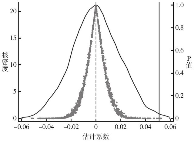 为了检验本文的实证发现是否受遗漏变量、随机因素等的影响,进一步说明实证发现不是偶然发生的结果,本文进行如下的安慰剂检验。借鉴 Cai et al(. 2016)的研究思路,本文随机选择国家重点产业政策支持的行业,据此构造了虚构的行业-时间层面国家重点产业政策冲击的随机实验。具体而言,本文依据国家在“五年规划”时期实际支持的行业数目,随机选取数目相同的行业以构造虚拟实验,再利用模型(1)重新进行相应的实证检验。如图 3 所示,在 1000 次的随机化测试中,核心解释变量的估计系数呈现以零为均值的正态分布,分布集中在零附近,且大多数估计系数的 P 值均大于 0.1。同时,本文的真实估计(表 2 中列(2))在安慰剂检验中是明显的异常值,即估计系数均在1000 次估计结果的 95% 以外。这意味着,本文并未遗漏重要的影响因素,即本文显著的实证结果确实是由于国家重点产业政策带来的,并非由于其他未控制的省份行业特征造成的。