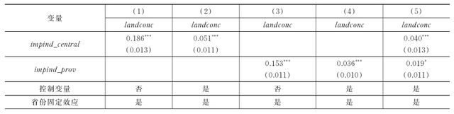 为了准确理解重点产业政策估计系数的经济含义,不妨以纳入了控制变量的表 2 (2)、列(4)和列(5)作为基准结果。在其列(2)中国家重点产业政策(impind_central)的估计系数为 0.051,且在1% 的水平上显著。从经济意义上看,当行业处于国家重点产业政策支持期间,土地要素配置的行业地理分散程度平均提高 0.051,约为平均土地要素配置地理集中熵(landconc)的 5.1%(0.051/1)。表2 列(4)中地方重点产业政策(impind_prov)的估计系数为 0.036,且在 1% 的水平上显著,表明当行业处于地方重点产业政策支持期间,土地要素配置的行业地理分散程度平均提高 0.036,约为平均土地要素配置地理集中熵的 3.6%。表 2 列(5)中国家重点产业政策的估计系数为 0.04,地方重点产业政策的估计系数为 0.019,二者分别在 1% 和 10% 的水平上显著,这意味着即使考虑了地方重点产业政策的影响,国家重点产业政策仍然显著促进了省内产业结构趋同,并且从二者的影响程度和显著性水平看,产业结构趋同主要是由国家重点产业政策导的,后文主要关注国家重点产业政策的影响。