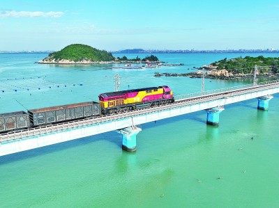 装运铁矿石的海铁联运班列经过福建莆田湄洲湾港罗屿作业区附近的一座桥梁。新华社记者 林善传摄