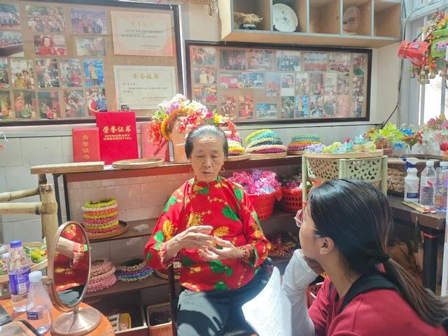 在与三位蟳埔女习俗非遗传承人的交谈中,实践队详细记录了服饰、簪花围、金银头饰等传统技艺的细节与价值。这些访谈不仅让队员们感受到了蟳埔文化的独特审美价值和精神内涵,也敏锐地捕捉到了其在当代传承与发展中面临的现实瓶颈。