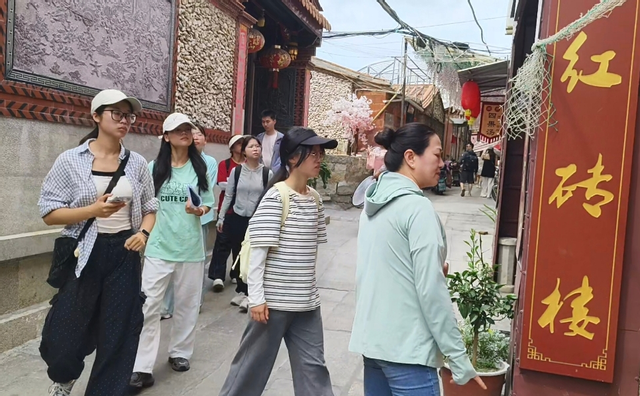 深入基层,方能触摸真实。实践队实地深入蟳埔民俗文化村。在蟳埔党支部社区副书记庄群的带领下,队员们探访了承载厚重历史的蚵壳厝、顺济宫等核心文化地标,直观感受蟳埔独特的人文风貌。通过入户访问居民、向游客发放问卷,广泛收集了不同群体对当地文旅产业发展的实际需求与反馈,力求掌握真实的社情民意。这种深入一线的调研方式,为团队后续思考提供了多角度的现实依据。