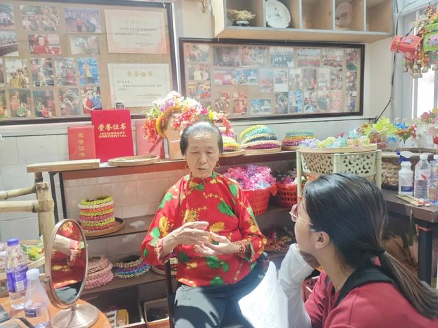 随后在与三位蟳埔女习俗非遗传承人的交谈中,详细记录了服饰、簪花围、金银头饰等传统技艺的细节与价值,并深入蟳埔民俗文化村,探访蚵壳厝、顺济宫等核心文化地标,通过入户走访、发放问卷,广泛收集不同群体对当地文旅产业发展的实际需求与反馈。