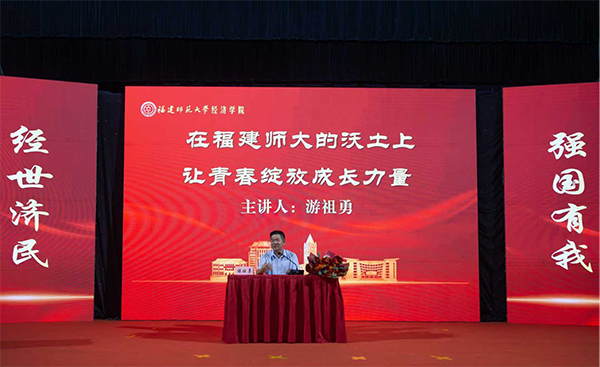 典礼后,经济学院校友、省水利厅原副厅长、一级巡视员游祖勇,以“在福建师大的沃土上,让青春绽放成长力量”为题讲授开学第一课。游祖勇将求学时期的探索与思考、步入职场后的实践与沉淀,以“梦想无边、青春无限、生命无价”三个主题,分享了自己的成长故事,并围绕“如何推动地区经济高质量发展”等话题进行现场互动。