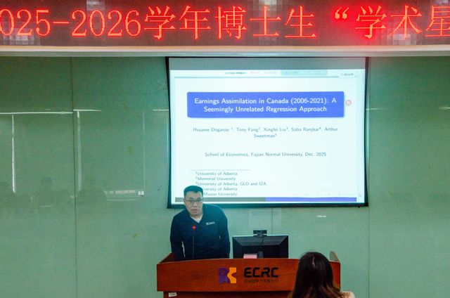 12月24日下午,我院在人文楼3-401道德讲堂成功举办“加拿大收入同化研究(2006-2021):基于似不相关回归方法的分析”专题学术讲座。本次讲座特邀加拿大阿尔伯塔大学经济学系长聘副教授、博士生导师、全球劳动组织(GLO)研究员、劳动经济研究院(IZA)研究员刘兴飞担任主讲人,经济学院王楚红副教授主持讲座,我院师生代表约60余人参与。