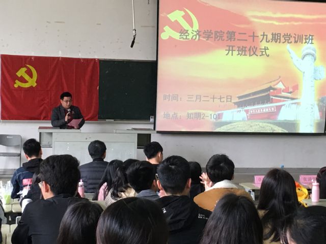 3月27日下午,经济学院第二十九期入党积极分子培训班开班仪式暨第一讲在知明2-101教室顺利举行。院党委书记林建荣、副书记张清国、团委书记许琛、各年级辅导员以及第二十九期入党积极分子培训班全体学员参加了本次活动。