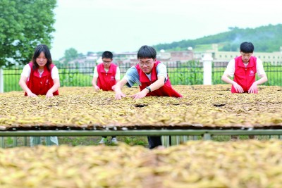 湖南衡阳黄土铺镇,大学生志愿者在帮助当地村民晾晒黄花菜。新华社发
