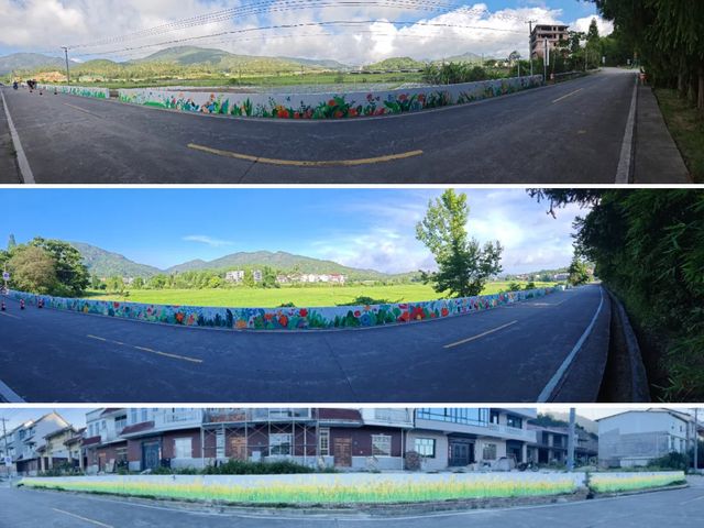 在墙绘设计中,实践队把养蜂产业助力乡村经济发展的美好景象、挺拔秀美的翠竹、蓝天白云、青山绿水、康庄大道等元素融入墙绘作品。不仅展示了乡村发展的新面貌,更传递了绿色、可持续的乡村发展理念,寓意隔壁村的繁荣与活力。