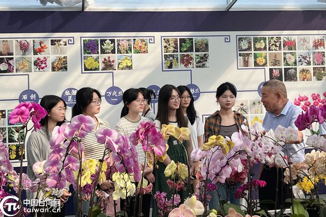 福建钜宝生物科技有限公司董事长黄瑞宝为实践队成员介绍兰花种植情况。(中国台湾网 发)