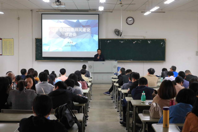 5月8日下午,我院召开师德师风建设推进会。院党委书记林建荣,院长黄茂兴,副院长黎元生、黄瑾、颜隆忠,全体教职工参加会议。
