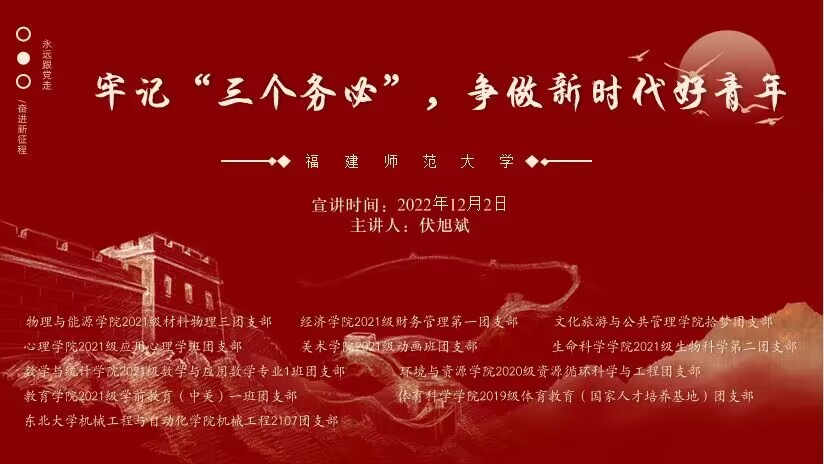 为学习贯彻习近平总书记关于青年工作的重要思想,深入学习宣传贯彻党的二十大精神,12月2日,我院2021级财务管理第一团支部联合物理与能源学院2021级材料物理三团支部等十余个团支部以及东北大学机械工程与自动化学院机械工程2017团支部联合开展以“牢记‘三个务必’,争做新时代好青年”为主题的团立项宣讲活动,会议邀请物理与能源学院团委书记伏旭斌老师莅临宣讲。