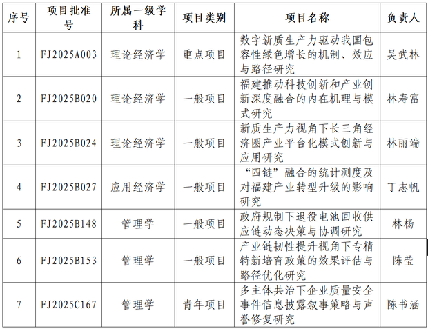 近日,2025年度福建省社会科学基金项目立项名单正式公布。我院一共获批7项,其中重点项目1项、一般项目5项、青年项目1项,比去年增加3项,立项率达70%。