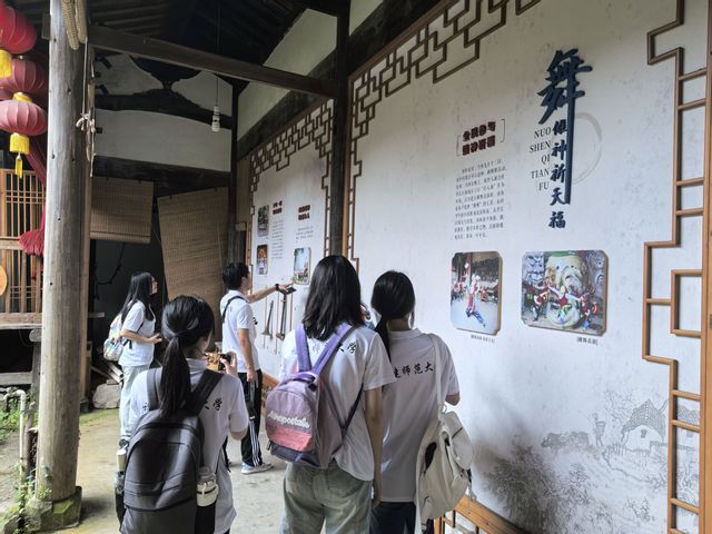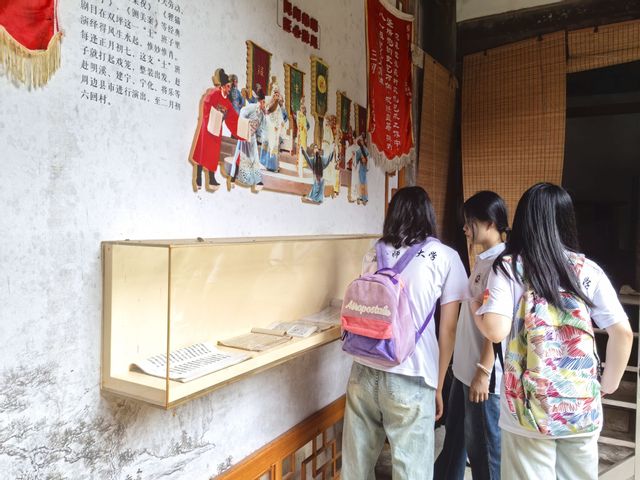 大龙乡在对李氏宗祠进行修缮保护的同时,将其打造为一个以双坪村千年发展为时间背景,以“耕、读、戏、舞”四种典型文化为展示核心的历史文化空间。窗外的白崖作为花岗岩地形地貌的代表,诉说着亿万年的地质变化,构成双坪村发展的地理基础;屋内泛黄陈旧的书本戏服,古色古香的梅林戏台,充满岁月痕迹的牌匾砖瓦、图文并茂的展板,无不生动地向队员们展示着双坪村多彩的历史文化和当地的民风底色。