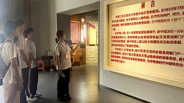 泰宁城区红军街,“红旗不倒”系列展馆无声诉说着峥嵘岁月,是“精神厚土”的集中展现。队员们潜心学习后,主动担当红色文化传播者,化身讲解员,用青春之声深情讲述泰宁的革命历史,让沉淀在这片厚土中的英雄故事焕发新的时代光芒,实现红色基因的薪火相传。