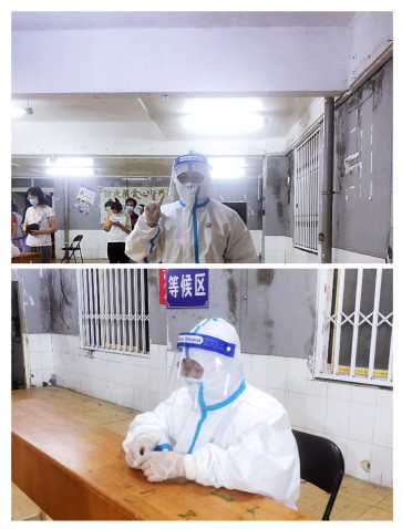 卢佳虹是我院2019级国贸专业学生,因一次偶然的机会,她来到南京这所城市。她说“当时在网络上看到了南京市委发布的志愿者紧急招募信息,便主动请缨参加这场防疫战斗。”她的主要任务是给社区的人员挨家挨户打电话,询问他们核酸检测的次数,健康码的情况,并让还没有做核酸检测的人员尽快去做核酸检测。志愿服务期间,她从早到晚打电话进行登记排查,还第一次穿上了防护服。