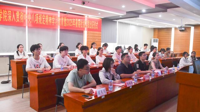 7月4日,我院举行深入贯彻中央八项规定精神学习教育暨2025年暑期社会实践出征仪式,院党委副书记叶龙祥,实践队指导老师代表、各年级辅导员、经行考察团成员、暑期社会实践团队负责人等参加出征仪式。仪式由学院团委书记李天丽主持。