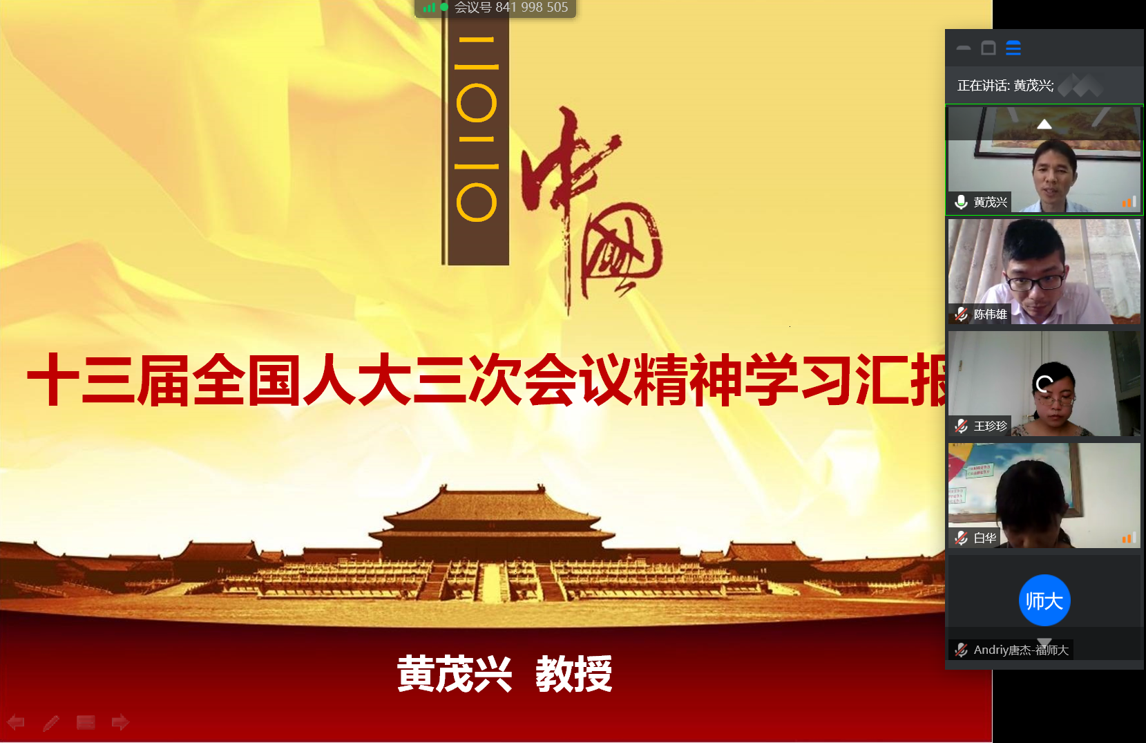 5月30日下午,十三届全国人大三次会议胜利闭幕后,履职归来的全国人大代表、我院院长、全国党建工作样板党支部和全国首批高校“双带头人”教师党支部书记工作室——全国经济综合竞争力研究中心福建师范大学分中心党支部书记黄茂兴教授,利用腾讯会议平台传达了刚刚闭幕的十三届全国人大三次会议精神,并畅谈心得体会,为党支部成员开展了一次深刻的党课教育活动。该党支部全体党员参加了此次学习报告会。此次宣讲活动旨在第一时间将十三届全国人大三次会议精神传递到基层党支部成员中,引导支部成员深刻领会“两会”精神实质,切实增强政治责任感和工作紧迫感,努力把学习成果转化为推动教学科研工作的动力源泉,进一步增强教学科研质量和竞争力。