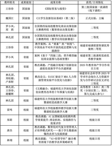工商系教师积极参与各类型教学竞赛、教改项目申报、教学案例撰写、教学成果奖申报以及教改论文撰写。2025年,共有1门课程入选第三批国家级一流本科课程,1部教材正式出版;教师获得国家级专业类竞赛奖项2项,教育部产学研合作项目1项,省级优秀教学案例2项,校级教学创新大赛2项,校级教改课题3项。参与申报的成果获省级教学成果奖二等奖1项。