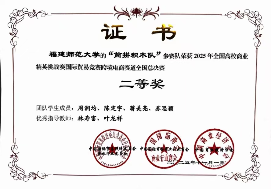 国贸系始终将学生创新能力和实践能力培养摆在突出位置,组建高水平竞赛指导教师团队,系统开展系列培育活动,助力学生在高水平专业赛事中屡创佳绩。2025年,获得全国高校商业精英挑战赛国际贸易竞赛跨境电商赛道二等奖2项、三等奖1项,还获得其他专业竞赛省赛一等奖1项、二等奖4项、三等奖1项。