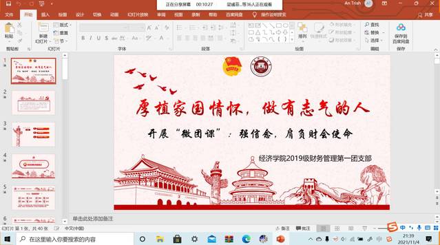 为深入学习贯彻习近平总书记在庆祝中国共产党成立100周年大会上的重要讲话精神,引导支部成员感受党对青年大学生的高度重视和殷切期望,11月3日至11月8日,我院2019级财务管理第一团支部于线上顺利开展了题为“强信念,肩负财会使命”的“微团课”。2019级财务管理第一团支部团支书韩秋诗主持活动。