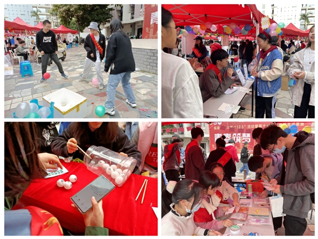 本次展位共分为特色志愿活动宣传区和游戏区两部分。宣传区展示了我院青年志愿者工作中心携手2021级金融学类第一团支部发挥专业优势,走进福州市仓山区对湖街道师大社区举办的“智学金融,谨防诈骗”金融知识进社区品牌志愿活动。游戏区设有“寻找‘防诈’秘诀”、“投入真‘箱’”和“戳破陷阱”三个互动小游戏,以寓教于乐的方式向学生介绍预防诈骗相关知识。在“寻找‘防诈’秘诀”小游戏中,参与者在装有乒乓球的箱子中夹出写有组成防诈小妙招的指定乒乓球;在“投入真‘箱’”小游戏中,参与者根据自己对“金融防诈骗”问题的判断投入对应的箱子;在“戳破陷阱”小游戏中,参与者踩破另一参与者的气球并回答气球里的“防诈问题”。整个活动吸引了许多同学参与,现场热闹非凡。
