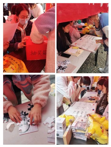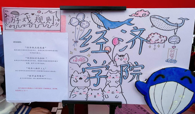 “经济人物P.I.L(拼凑、介绍、学习)”游戏中,参与者对着指定拼图在规定时间拼好后,由负责同学为他们介绍人物事迹、贡献等并赠与小礼品以增强同学们的经济学素养;“经济热点连连看”小游戏中,工作人员将一些带有经济学相关内容的词语写成小纸条让参与同学抽出,参与者在合理范围内连词成句并予以展示即可兑换奖品;在数字益智题目小游戏中,参与者移动一根火柴使用火柴拼成的等式成立,即可获得小奖品。在这些小游戏中既包含趣味性,又考验同学们的发散思维。整个活动吸引了许多同学参与,现场热闹非凡。