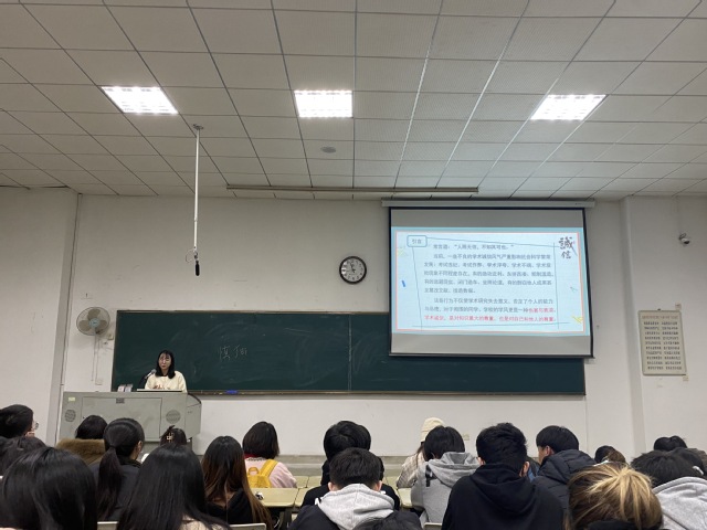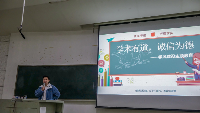 各年级辅导员聚焦学术诚信的重要性,就学术诚信的概念、类型及重要性进行阐述。辅导员们还就学术论文诚信展开特别介绍,借用具体案例分析,激励同学们做优良学风的建设者,坚决抵制诸如一稿多投等学术不端行为。辅导员们还强调,学习是一个吃苦的过程,用所学所得服务他人、奉献社会,最终以实现自身价值,呼吁同学们用优良的学风砥砺品格、规范言行,诚信考试、诚信科研、诚信为人,努力成为坚守学术诚信、完善学术人格、维护学术尊严、摒弃学术不端的楷模,以实际行动为建设创新型校园、创新型国家贡献力量。