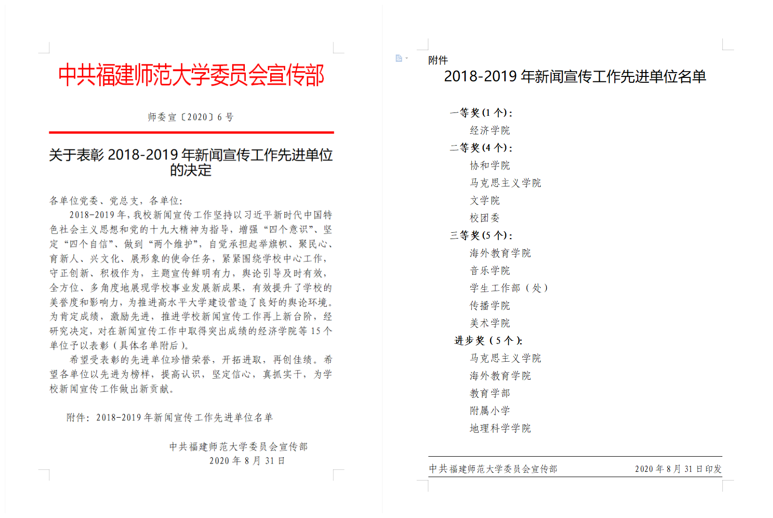8月31日,福建师范大学 2018-2019新闻宣传先进单位获奖名单公布,我校对在新闻宣传工作中取得突出成绩的15个单位予以表彰,我院在此次表彰中荣获“2018-2019年新闻宣传工作先进单位一等奖”。