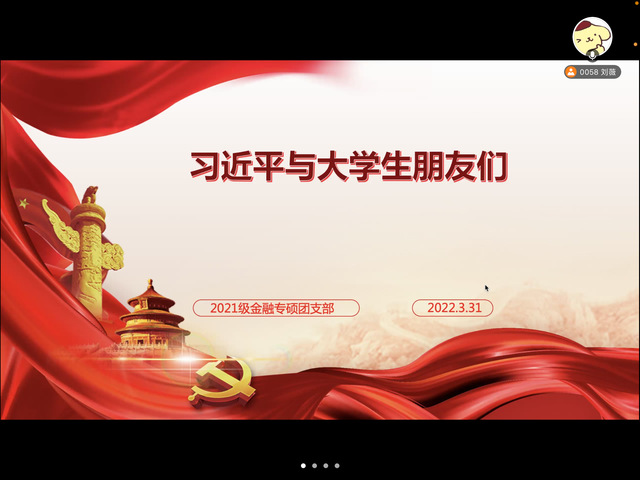 为深入贯彻学习习近平总书记所强调的实干精神,我院2021级金融专硕团支部于3月31日采用线上会议的形式开展了《习近平与大学生们朋友们》主题学习会。此次活动由团支书刘薇主持。