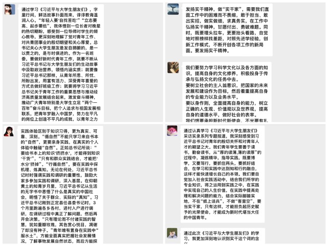 活动伊始,团支书带领大家一起阅读采访实录,学习习近平总书记始终如一的实干作风,感受习近平总书记对青年大学生成长成才的热切关注。习近平总书记通过分享自身在陕北梁家河插队时的工作和生活经历来告诫同学们“社会最需要、最欢迎有实干精神、能解决实际问题的人,而最不欢迎夸夸其谈、眼高手低的‘客里空’。”接着,团支书向大家科普了“客里空”一词的来源和内涵。“客里空”来源于话剧《前线》里的一个记者角色名字,该记者仅靠捕风捉影和道听途说来编造新闻。后来,“客里空”一词被用于泛指作风浮夸和华而不实的人。最后,同学们在线上交流了各自的心得体会,表示习近平总书记的谆谆教诲温润人心,作为新时代大学生要不断从习近平总书记与大学生朋友们的生动故事中汲取政治营养,领悟内涵实质,将自己所学所想运用到实践中去。