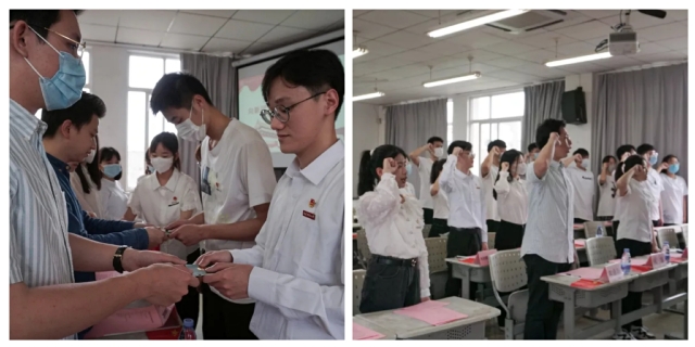 仪式在庄严的国歌声中拉开序幕,主持人宣读新团员名单,并颁发团员证和团徽。学院团委书记张翼作为领誓人,带领全体与会团员进行入团宣誓仪式,团员们用有力的宣誓、饱满的面貌、昂扬的斗志向团组织表明决心。随后,院团委副书记侯欣同学宣读《团章》中有关团员的义务和权利的条款,提醒新团员时刻牢记自己的身份,提升自身素质,坚定信念。活动中,新团员青年代表2021级国际商务专业研究生韩杰喜同学、老团员青年代表2019级经济学专业韦卓翔同学依次发言,鼓励团员们时刻不忘入团初心,坚定不移听党话,跟党走,坚定理想,锤炼本领,磨砺意志,强健体魄,增长才干,在青春的赛道上跑出当代青年的最好成绩。