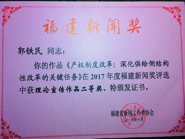 近日,2017年度福建新闻奖评选结果正式公布。我院原院长郭铁民教授的作品《产权制度改革:深化供给侧结构性改革的关键任务》荣获理论宣传作品二等奖。