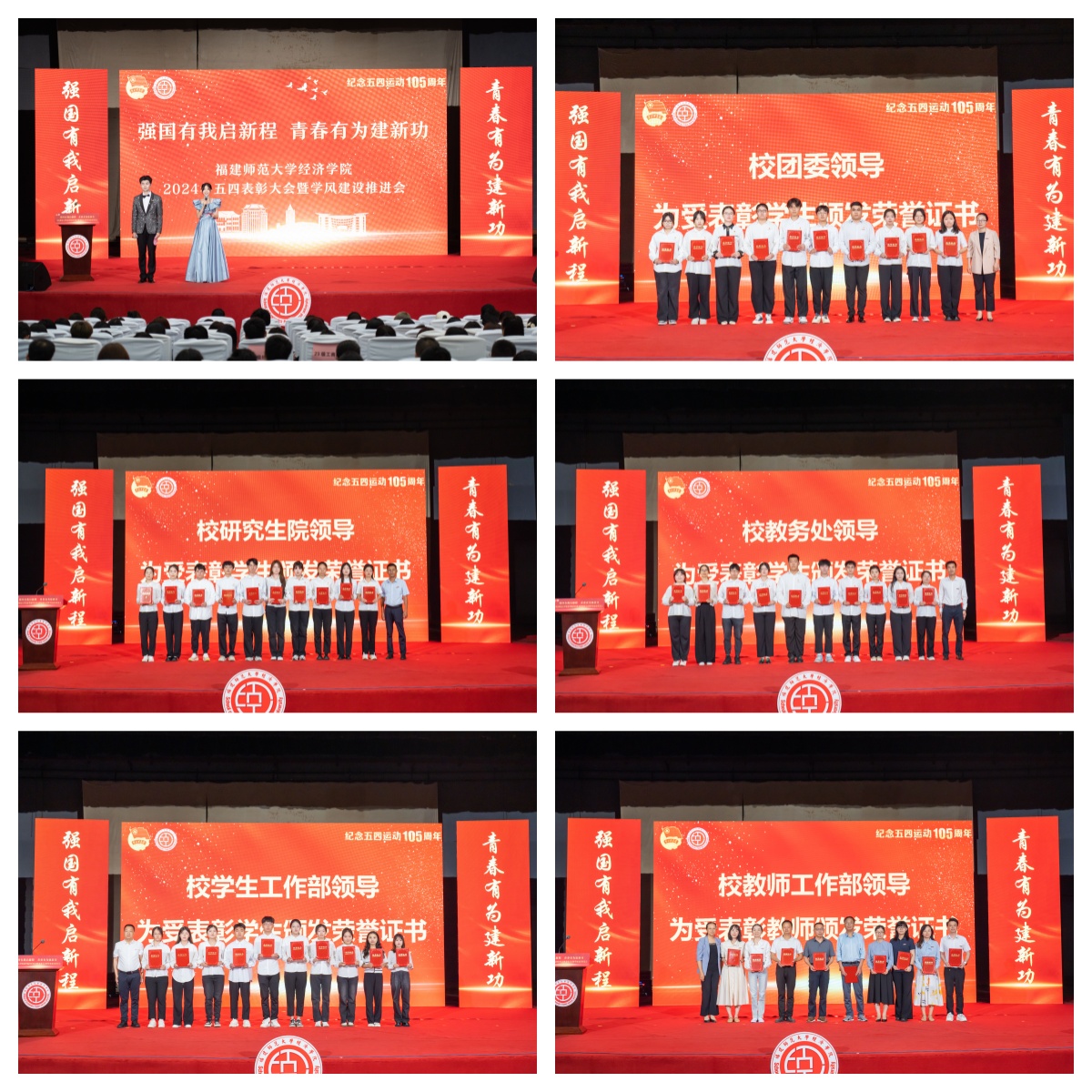 5月8日,经济学院在图书馆大会堂举行“强国有我启新程,青春有为建新功”2024年五四表彰大会暨学风建设推进会。校教师工作部副部长李岩丽、学生工作部副部长乐有方、教务处副处长周志强、研究生院副院长蓝凯仔、校团委副书记吴小英,学院党政领导、关工委主任,各科室、各系(教研室)负责人,各年级班主任、辅导员,受表彰师生代表、本硕博学生代表参与大会。