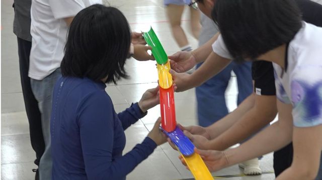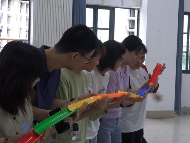 “珠行万里”:槽中运球,无缝接力。 这是对耐心与配合的极致考验。老师们手持U型塑料接力槽排成一列,让乒乓球顺着接力槽滚动,全体队员循环接力。只见大家屏住呼吸,小心翼翼地倾斜接力槽,球在槽中缓缓滚动,完成一次传递后,队员迅速跑至队尾续接。