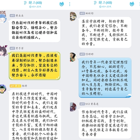 活动前,团支部书记范歆婷同学发布活动预告,引导支部成员共同学习学联会议相关内容及精神。活动中,支部成员认真研读习近平总书记贺信、孙春兰副总理讲话和学联报告等内容,并在线上“云会议”中发表了积极的学习感言,深刻领悟了作为新时代青年大学生的时代责任与发展机遇,并对新学年新的学习规划有了明确的引导。少年智则国智,少年强则国强。通过交流与学习,支部成员对即将开启的新学期新征程有了更加清晰的目标和更为明确的学习规划,也更加牢记习近平总书记对新时代的中国青年的希望与要求,明晰青年一代的责任与担当。